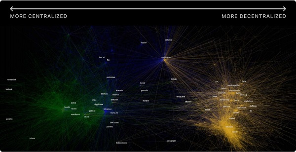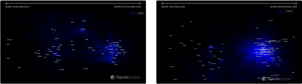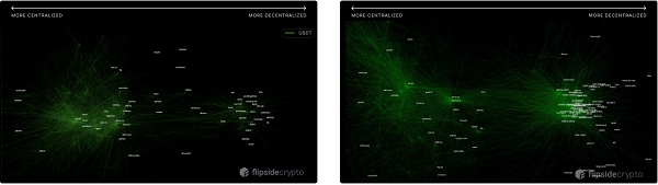 另外需要注意的是,在中心化集中式交易所和去中心化应用程序上都没有多少地址使用USDT,从图表中也可以看到两个群集中并没有太多线连接在一起。我们在每个主要的稳定币中都看到了这一趋势:DeFi行业正在独立发展,并且逐渐开始与中心化加密货币交易所用例脱钩。