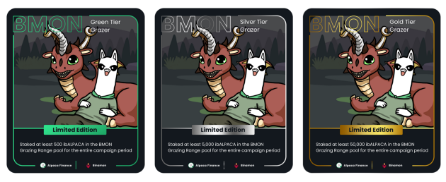 要符合领取资格,您必须在 GMT 时间 10月 22 日上午 10 点前 (即牧场池上线后 1 天内),在 BMON 牧场池质押 ibALPACA,至少质押至 GMT 时间 11 月 18 日上午 10 点前 (至少 27 天)。 您收到的 NFT 卡片等级将以质押的 ibALPACA 数量来决定。