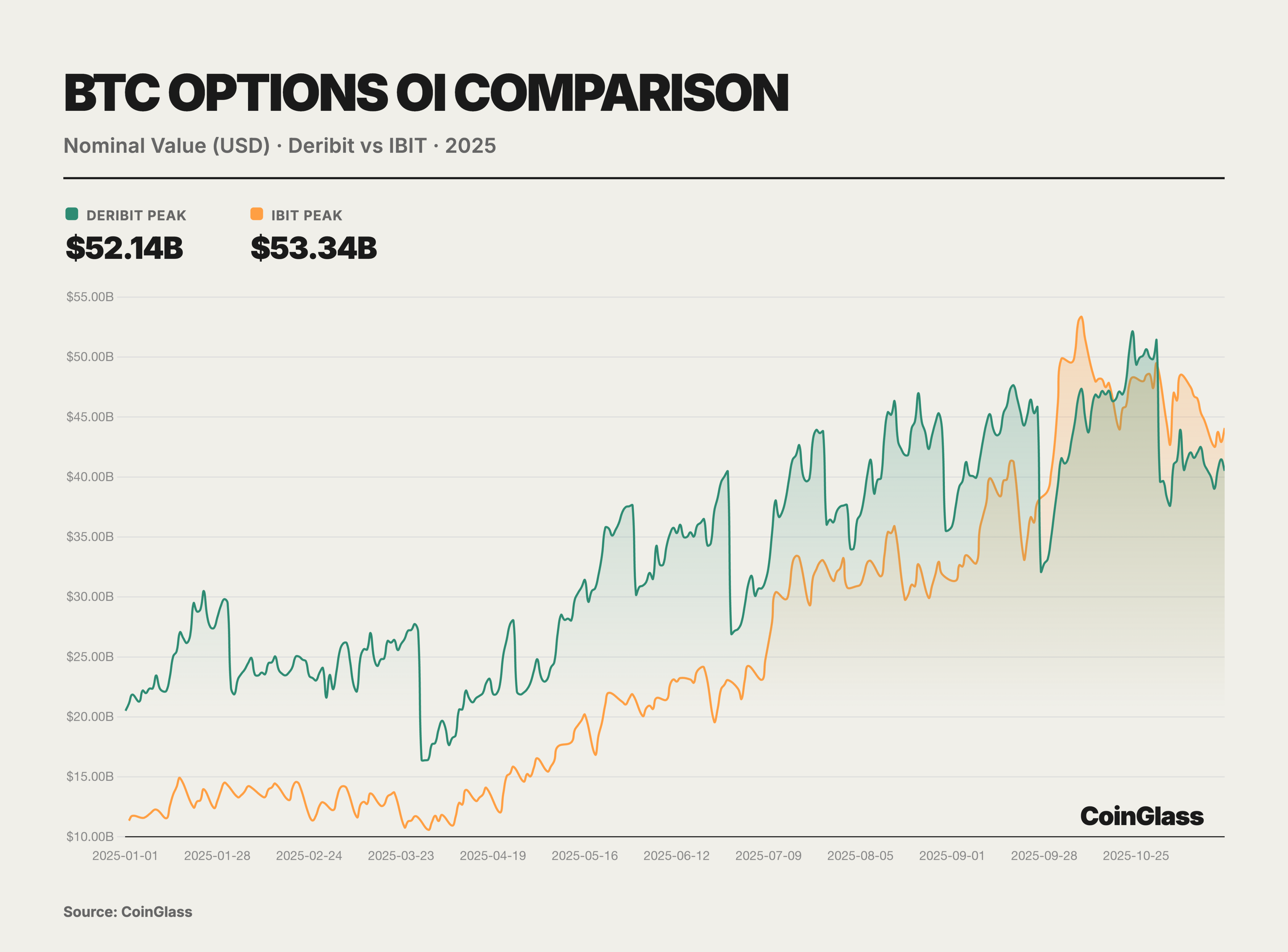 这一年中,传统金融机构的介入成为期权市场变化的分水岭。随着美国监管环境的演变,多家华尔街机构推出了 BTC ETF 及其期权产品。尤其引人注目的是贝莱德推出的 IBIT 于 2024 年 11 月开始提供期权交易,在 2025 年迅速崛起为 BTC 期权市场的新巨头。总体来看,2025 年的市场格局呈现双轨特征:一方面是以 Deribit 等为代表的 crypto-native 平台,另一方面是以 IBIT 等 ETF 期权为代表的传统金融渠道。