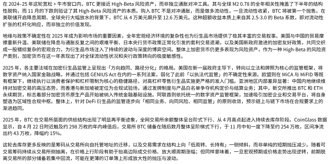 CEX 侧全年约 85.7 万亿美元成交量下,OI、深度与托管高度向头部集中,头部平台提升价格发现与执行效率,也把合规、运营与技术事件放大为系统性风险;在库存下行、订单簿变薄下,这种集中化同时放大上涨的边际推力与下跌时的流动性真空。极端清算暴露保证金—清算—保险基金—ADL 链条的脆弱:保险基金承压、跨平台划转拥堵时,ADL 的非透明执行与偏离市价减仓会拆解对冲腿,使中性组合被动转为方向性风险,风控需围绕清算机制与资金可达性重做压力测试。制度化在场内衍生品与 DAT 上更集中:CME 推出现货报价期货等合规创新,推动基差交易常态化,将 ETF 现货需求与期货对冲连接成可复制的套利链条;DAT 在会计与融资工具驱动下形成资产负债表型配置 / 融资飞轮,买盘更「锁定」,但风险重心从币价迁移到融资结构、公司治理与监管冲击。期权市场定价权亦在迁移,合规交易所并购整合与 ETF 期权崛起使 BTC 波动率流量向传统金融渠道集中。DeFi 端 PerpDEX 依托高性能应用链与 intent-centric 架构逼近 CEX 体验并走向多强竞争,预测市场与钱包的账户 / 链抽象把发现、交易与分发前移到应用层。