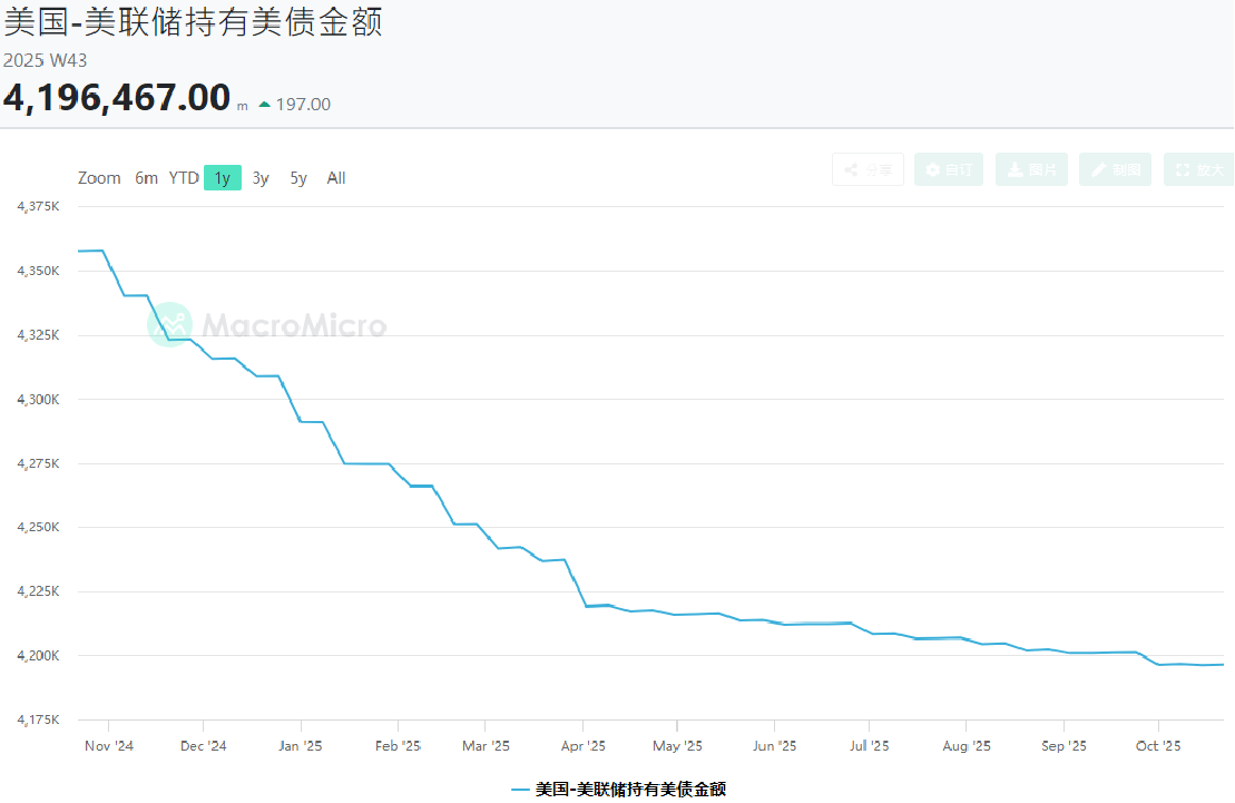 最近一个月(Week39-43),美联储小幅减持美债 47 亿美元,阶段性收紧流动性,但当前缩表节奏已完全走平,意味着流动性收缩进程接近尾声。市场焦点转向 12 月 15 日,届时美联储是否开启扩表成为关键变量,若流动性重新宽松,将对风险资产形成直接利好。