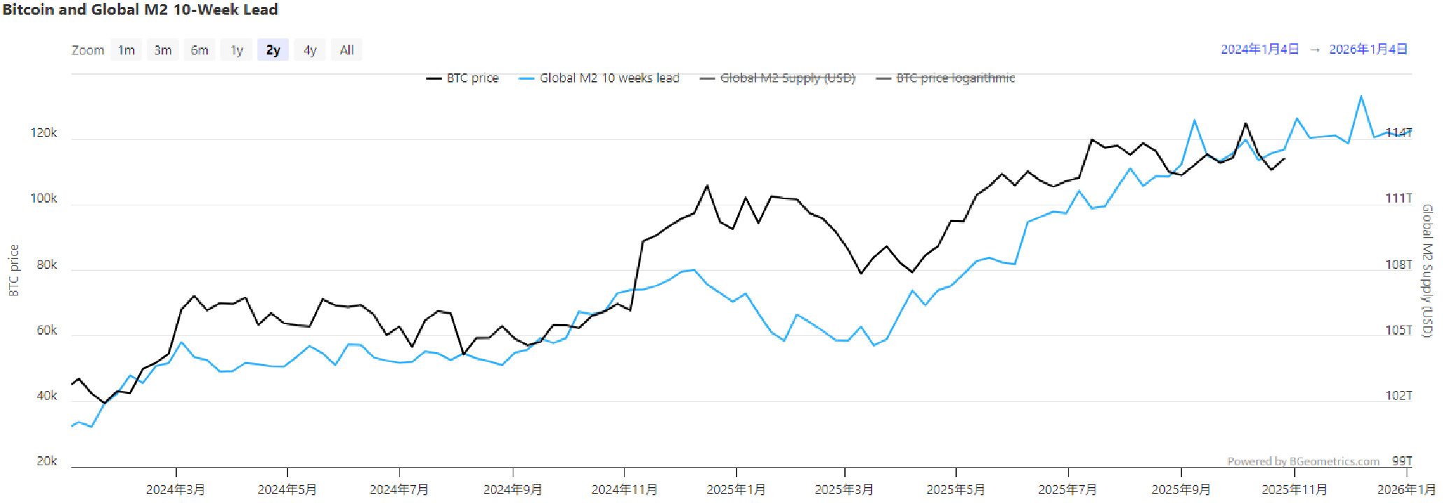 全球 M2 呈现脉冲式震荡上升态势,核心驱动因素是全球宏观经济不稳定与地缘政治冲突下,各国财政量化宽松的人为推动。这种宽松模式具有明显时间节奏,每 4-5 周会出现一次新高,且传导至 BTC 的时间约为 10 周左右。