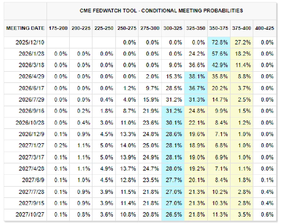 利率互换市场数据显示,2025 年 12 月 10 日降息 25BP 的概率为 73%,年内仅剩余此次会议;2026 年市场预期将在 4 月和 9 月各降息 25BP,累计 50BP,中性利率有望降至 3.25%。巴克莱银行指出,当前市场定价过于鹰派,未充分反映劳动力市场走弱及新任美联储主席可能采取的鸽派立场,未来存在预期修正空间。