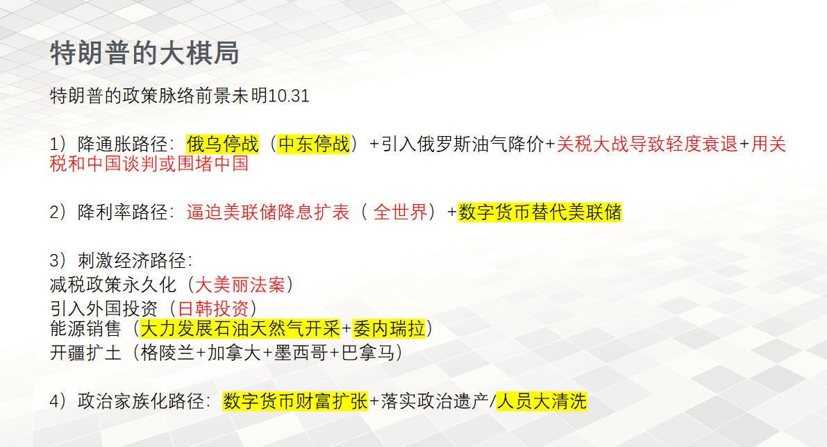 - 政府停摆:通过停摆实现多重目标,包括隐藏负面经济数据、逼迫美联储降息扩表、趁机进行民主党人员清洗,强化执政基础。