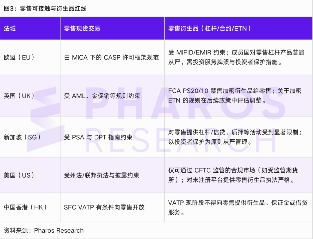 亚洲各国对于加密衍生品的监管呈现截然不同的取态。日本于 2019 年修订《金融商品取引法》,将加密资产衍生品纳入金融商品类别,并对从事加密差价/期货交易的业者实施注册监管。日本交易所可为客户提供加密保证金交易,但日本自律规则已将最大杠杆率从 25:1 大幅调降至 2:1。因此,日本用户仍可交易小杠杆的比特币合约,但市场规模受限。韩国则干脆禁止本国交易所提供任何形式的加密期货或期权,认为散户风险过高;韩国投资者如要交易,只能借道海外平台,但韩国政府近年加强监控,要求银行限制对海外加密衍生品平台的汇款。香港在 2023 年推出持牌制度时,明确不允许向散户提供加密衍生品交易,只能提供标的现货交易;专业投资者是否可以通过香港平台参与衍生品也受严格限制。香港仅允许经证监会批准的资产管理公司发行挂钩加密的结构性产品或ETF在受监管市场交易(如香港交易所上市的加密资产期货 ETF,面向公众)。新加坡 MAS 对衍生品持谨慎态度,2019 年批准新交所 (SGX) 上市比特币、以太坊掉期合约,但规定零售不能直接参与,仅开放给机构和专业投资者。此外,MAS 在 2022 年强化投资者保护指引中,限制零售获取高风险加密产品,包括衍生品,并要求本地服务商不得通过 ATM 或广告轻易向公众推广任何加密交易服务。总体看,亚洲主流市场多限制零售接触加密衍生品:日本允许但监管严、杠杆低;香港、新加坡、韩国几乎禁止散户参与,只对机构/专业开放有限渠道。这与部分西方市场的开放形成对比。