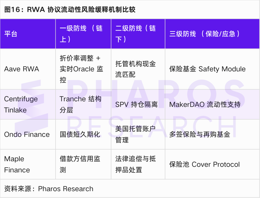 RWA 市场的流动性风险主要来自“链上估值不确定 + 链下兑付延迟”双重因素。为缓释风险,国际主要平台通常建立三层防御体系: