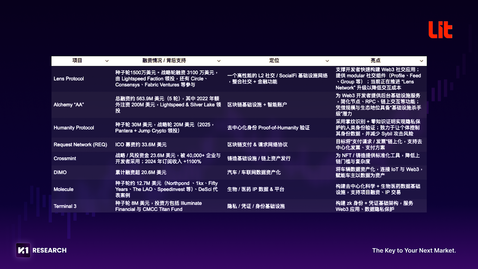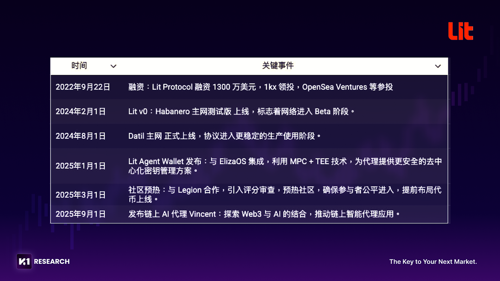 2022 年 9 月:完成由 1kx 领投的 1300 万美元 A 轮融资,OpenSea Ventures、Balaji Srinivasan、Stani Kulechov(Aave 创始人)、Raj Gokal(Solana 联合创始人)等参投。作为顶级基金,1kx 长期专注去中心化身份和 Web3 基础设施投资,其入局为 Lit 的技术路线提供强力背书;同时 OpenSea Ventures 的加入,凸显了 Lit 在 NFT 资产管理与跨应用互操作性上的潜在价值。