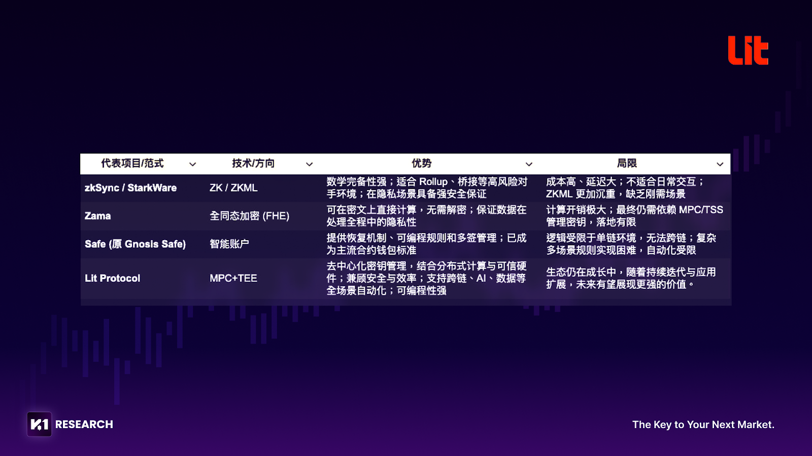 截至 2025 年 9 月,Lit Protocol 的产品已管理资产规模(AUM)超过 3.4亿美元,覆盖钱包数量接近 166 万 个地址,已为 Alchemy、Lens Protocol、DataverseOS、Humanity Protocol 等多个项目提供密钥管理与访问控制服务。Lit 因其政策驱动的自动化与隐私保障以及在可编程签名与加密逻辑方面的创新,成为这一领域的领先者。