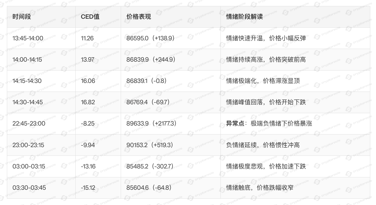 趋势结论:极端负情绪区间(CED < -10)虽然价格平均变化率为正,但情绪-价格一致率最低(37.5%),表明极端悲观情绪往往出现在价格反转前夜;中性情绪区间价格波动最小,情绪与价格方向匹配度相对较高。