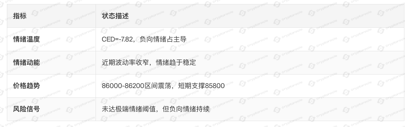当前BTC市场处于情绪修复期,负向情绪虽未达极端水平但持续压制价格表现。技术面显示86000附近形成短期支撑,情绪与价格出现一定背离迹象。预计短期内将继续震荡整理,需关注情绪能否有效回暖以支撑价格突破。风险偏好投资者可关注情绪指标转正时的入场机会。