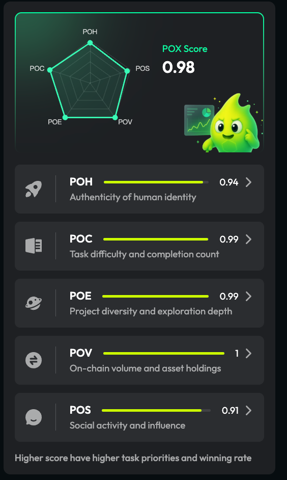 同时,TaskOn上线了全新的 POX 评分系统围绕五个维度进行用户身份和参与行为进行交叉评分: