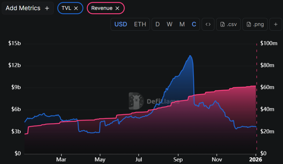 2025年,Pendle TVL从43亿美元下滑至37亿美元,同比下降约13%。不过,其累积收入从1,799万美元稳步上升至6,156万美元,同比增长242%,体现出了协议基本面的韧性。即便在市场下行周期,Pendle依然具有稳定的创收能力。