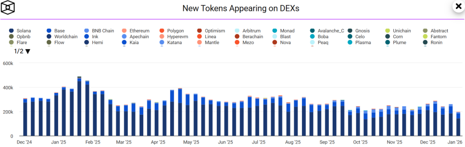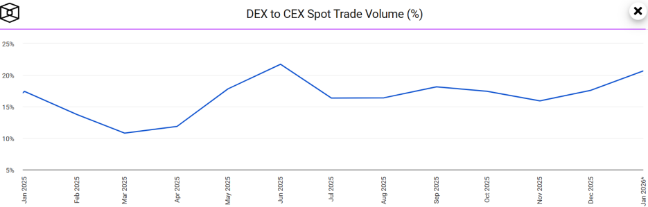 2025年,DEX的用户粘性显著增加。在连续八个月内,DEX对CEX的交易占比均维持在15%以上,打破了往年只有在牛市巅峰才短暂冲高的规律。