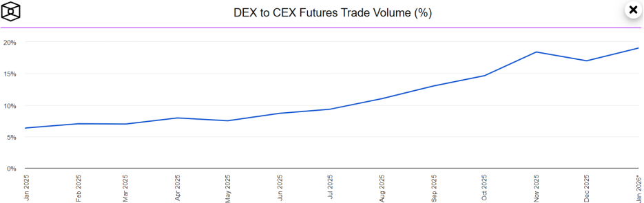 2025年,Perp DEX赛道合约持仓量超过160亿美元,交易量相对CEX的占比从6.34%跃升至17%。