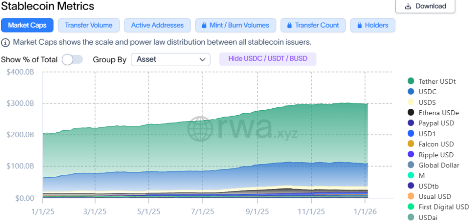 稳定币作为DeFi的血液,在2025年迎来了规模与格局的双重演变。总市值一度攀升至3,000亿美元,竞争格局则呈现出“双极垄断下的内部革新”。