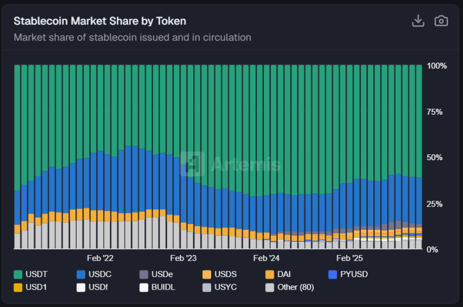 USDT仍以60%以上的份额保持着绝对领先,USDC则凭借透明度与合规性位居次席。
