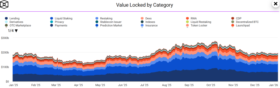 然而,第四季度一场突如其来的10/11闪崩,如冰水浇头,让TVL急剧缩水至1,893亿美元,全年涨幅被抹平至微不足道的3.86%。这场剧烈的波动,撕开了DeFi华丽叙事下的真实肌理:一边是质押、借贷、RWA等赛道的深度演化,另一边则是杠杆堆积下的脆弱性与治理割裂的隐痛。