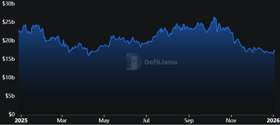 2025年是收益赛道从细分利基市场跃升为DeFi基础设施的一年,其TVL从81亿美元升至91亿美元,同比增长12.5%,年内高点约188亿美元。