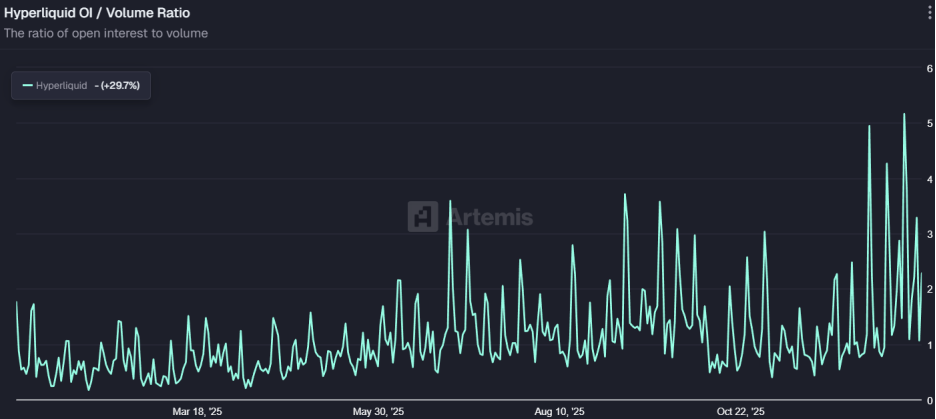 Hyperliquid是Perp DEX赛道的排头兵,其支持20万TPS和亚秒级结算,性能已与主流CEX无异,年交易量从6,175亿美元爆炸式增长至3.55万亿美元。协议的OI/Vol(未平仓量/交易量)比率长期维持在2左右的高位,表明其交易多为真实的套期保值和趋势性头寸,而非单纯的刷量挖矿。
