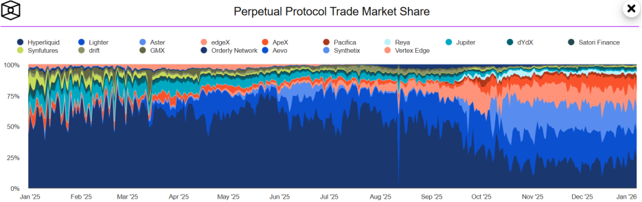 挑战主要来自两个有力竞争者:一是背靠币安生态、擅长社交裂变的 Aster;二是以ZK证明技术为矛、开创零费率模型的Lighter。两者在2025年内合计抢走了一半市场份额,迅速分流了散户资金。