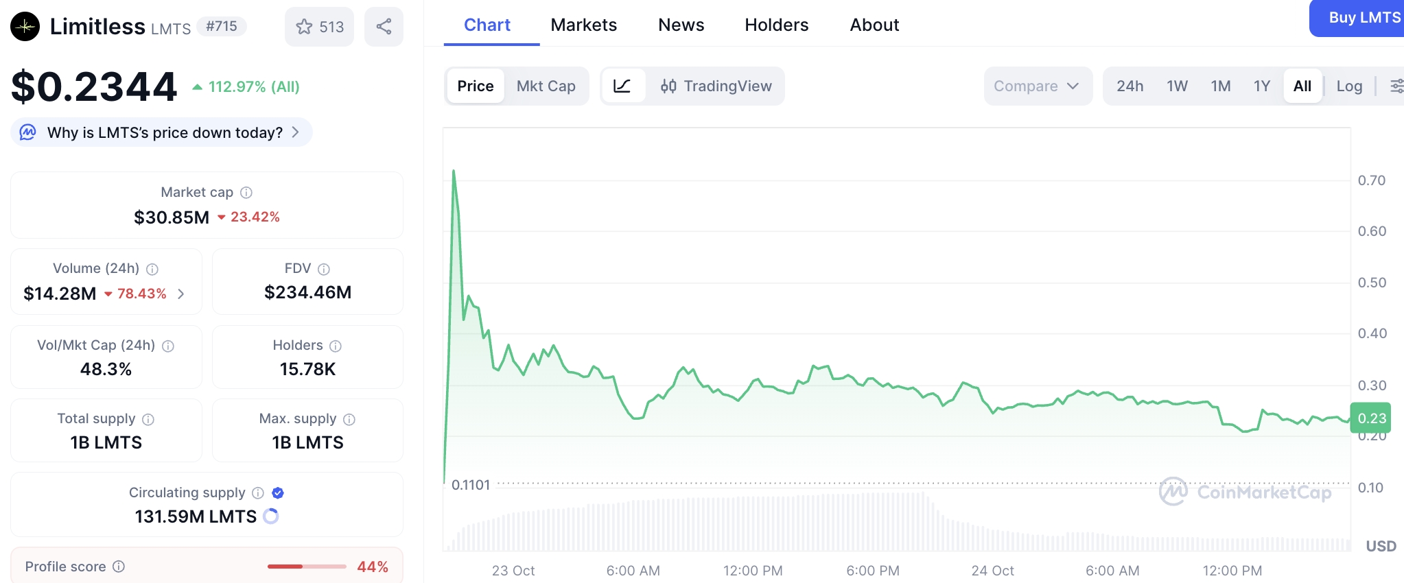 Figure 1. LMTS token price. Source: https://coinmarketcap.com/currencies/limitless-lmts/