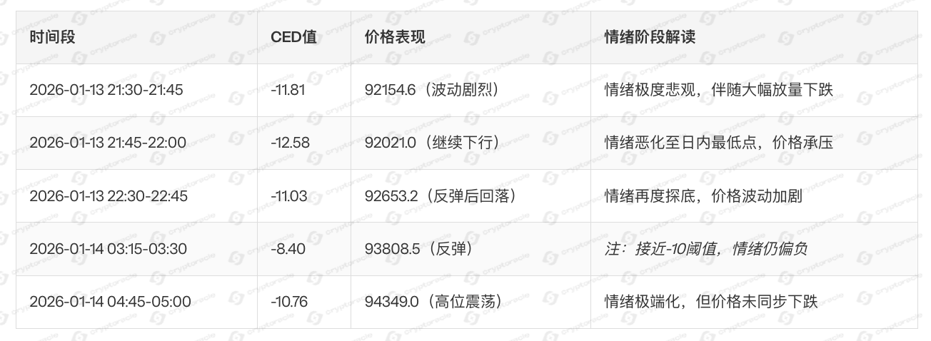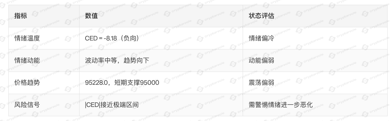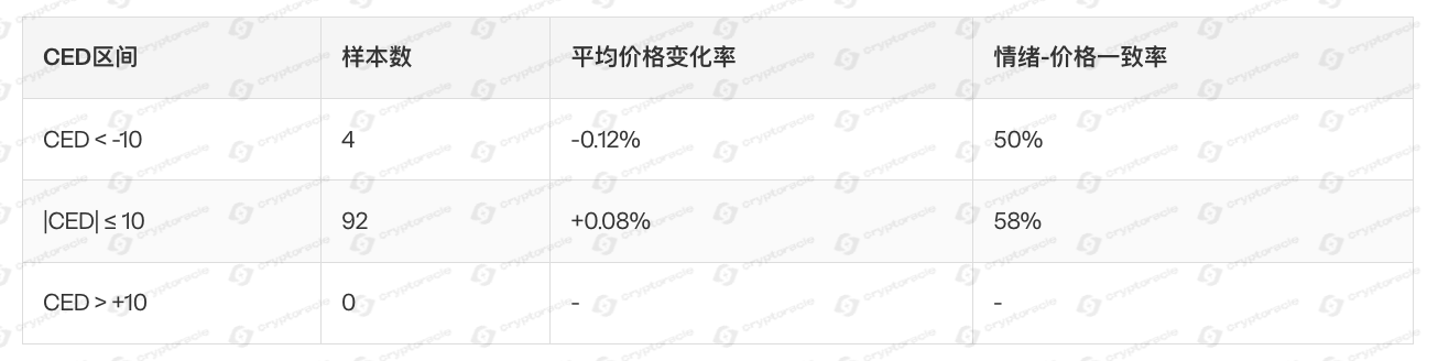 - 极端负情绪区间(CED < -10)价格表现偏弱,但情绪-价格一致率仅50%,说明情绪极端化时价格方向不确定性较高
