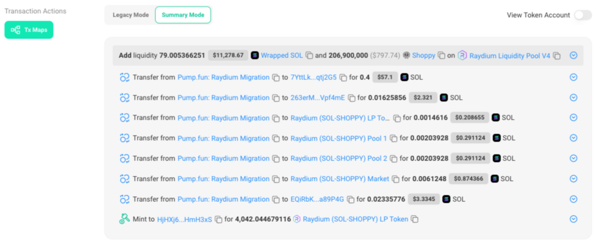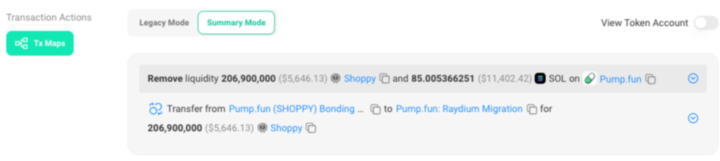 当 Bonding Curve 的净买入超过 85 SOL 时,PUMP.FUN会从 bonding curve 内提取 85 SOL 和 206,892,286.3554 个单位。在 Raydium 上创建交易对并添加流动性的过程中,平台会抽取 6 SOL 的费用(85 SOL 减去 79 SOL)。