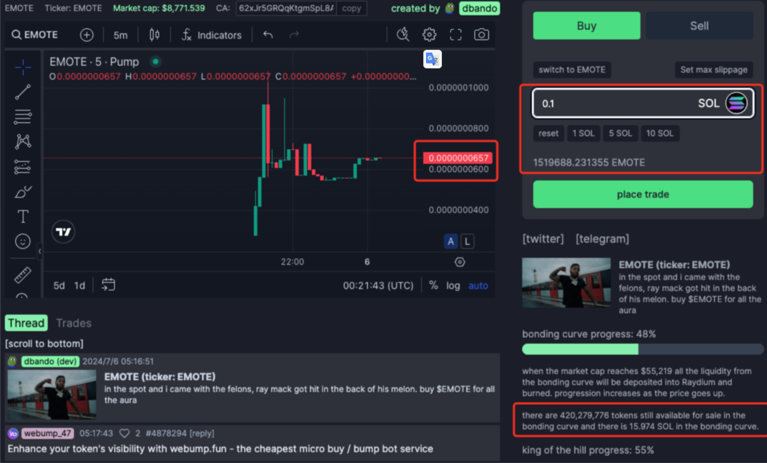 早期访问和盈利潜力:PUMP.FUN 允许用户在代币在 Raydium 上线之前购买,这意味着用户可以以较低的价格获得代币。随着项目被市场的关注增加,这些早期投资者有可能获得较高的回报。