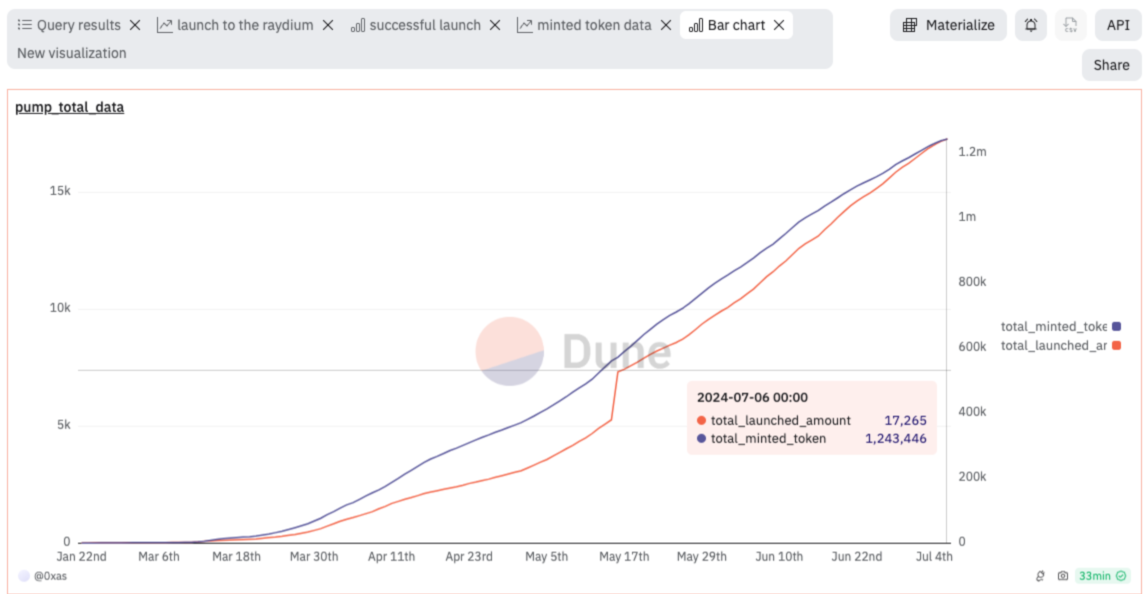 截至7月6日,PUMP.FUN 平台上累积发行了1,241,363个代币,成功筹集了17,228个代币,成功筹集比例为 1.388%。