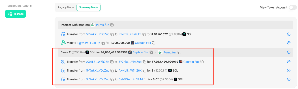 可以看到创建名为 Captain Fox 的代币,总量为10亿,然后用户收到≈67062500个代币,支付了2个sol,购买的手续费1%,既0.02sol。