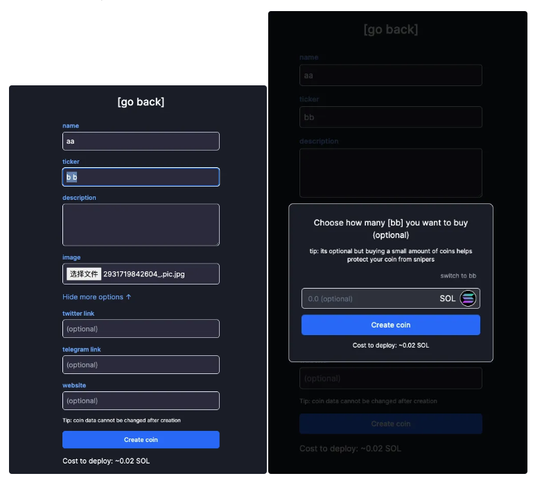 - 输入信息:用户填写代币名称、符号,并上传代表性的 Logo 图片。此外,用户还可以选择添加 Twitter、Telegram 和官网链接等信息。