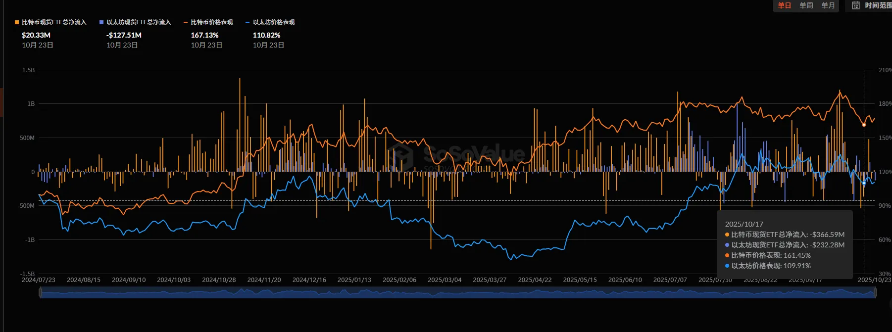 本周 BTC ETF 净流出 1083 万美元,较上周 6.7 亿美元的净流出大幅收窄 —— 核心原因是 10 月 21 日消息面刺激下,单日录得 4.7 亿美元净流入,对冲了其余时间的流出。但需注意,BTC 价格在当日拉升后快速回落,后续若要形成趋势性上涨,需观察 ETF 资金能否实现 “有节奏的持续流入”。