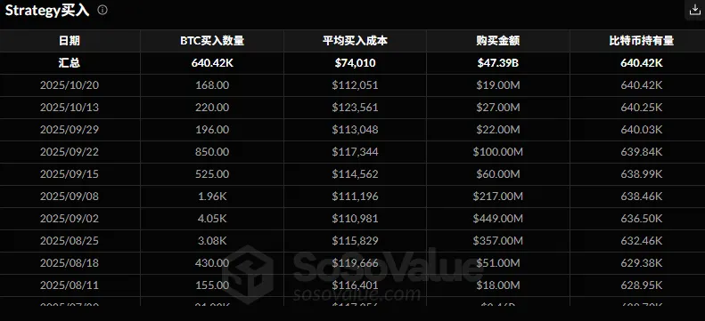 10 月 20 日,微策略以 11.2051 万美元 / 枚的均价,花费 1900 万美元购入 168 枚 BTC。对比上半年购币节奏,其近期单次买入数量显著减少,反映机构对当前价格的配置意愿有所谨慎。