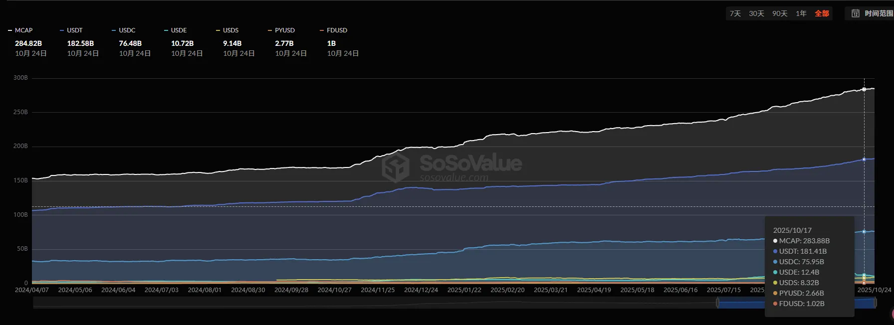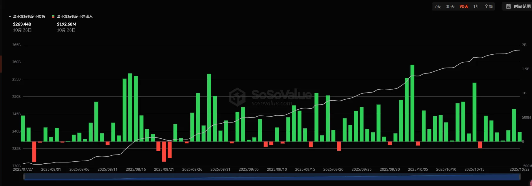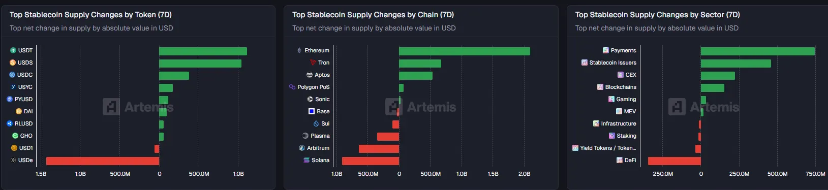 稳定币总市值 2848 亿美元,环比增加 0.32%,法币支持稳定币合计净流入 9 亿美元,长期趋势仍向好;