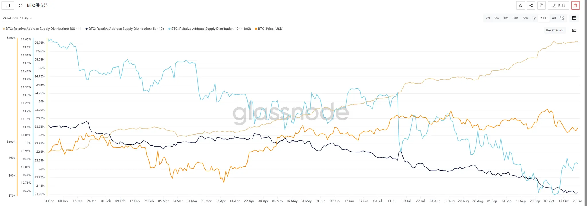 100-1K 枚区间地址:持币占比从上行趋势转为横向震荡,中小投资者购买兴趣降温;