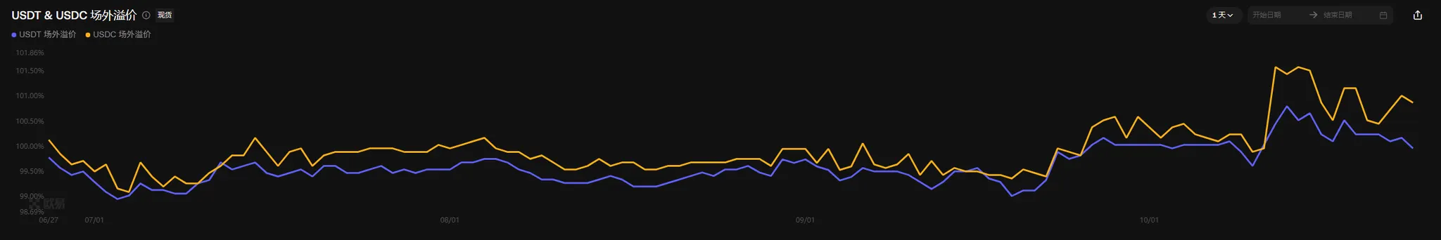 上周市场大跌推动场外资金抄底,使 USDT、USDC 溢价率升至高位;而本周两者溢价率在高位转入震荡,与大盘波动性收缩的走势相契合。这表明,市场既无大跌后的恐慌情绪,也缺乏持续抄底的积极性,整体情绪趋于平淡。