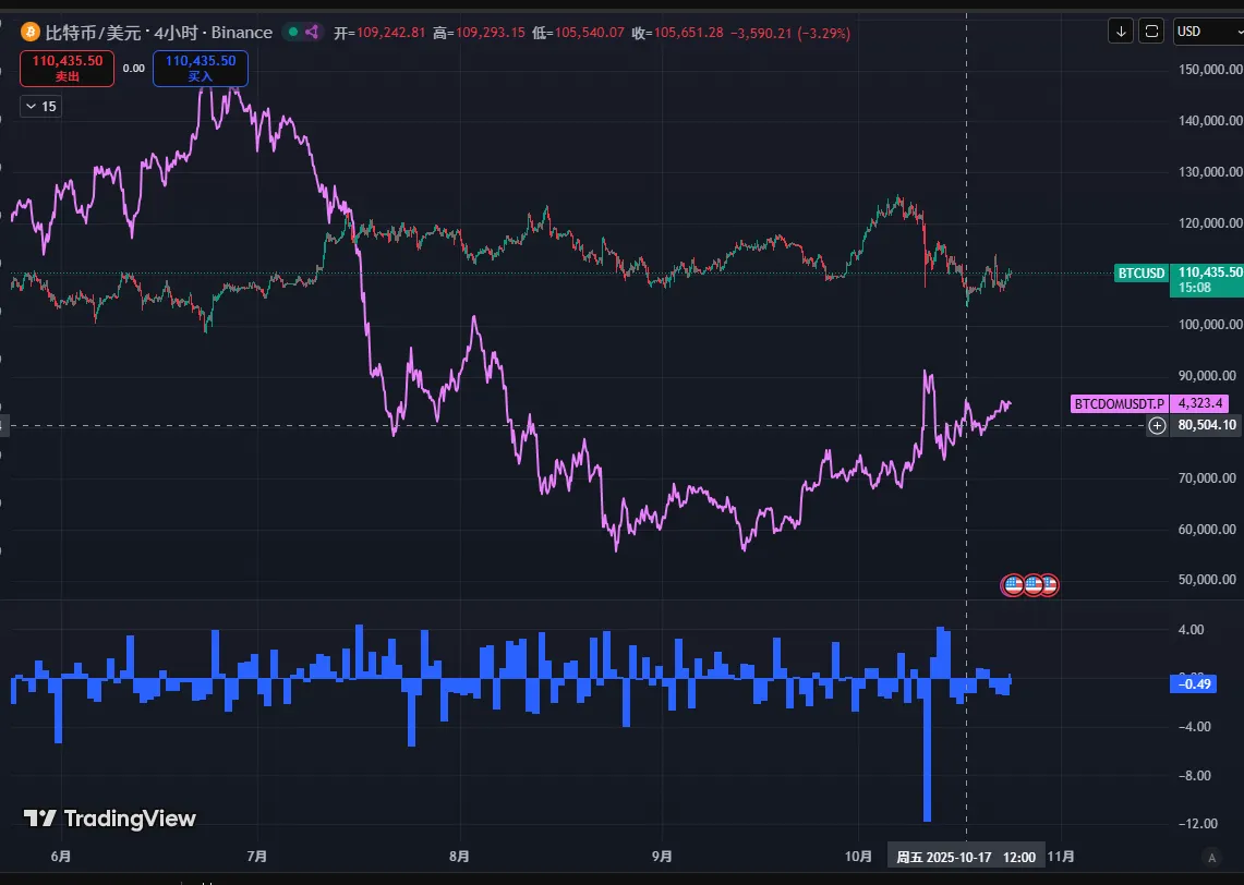 本周市场呈现 “反弹 - 回落 - 震荡” 走势:10 月 18 日起震荡反弹,20 日触及 11.1 万美元高位,但 1 小时、4 小时 K 线走势波折,反映多头信心不足;20 日晚间出现流畅深跌后,21 日下午受 “俄乌会谈” 消息刺激 —— 叠加黄金 5% 回调的联动效应,BTC 晚间滞后拉升,但随后俄罗斯否定停战条件,价格再度回落。截至目前,市场仍处于震荡区间,短期反弹暂未显现强趋势特征。