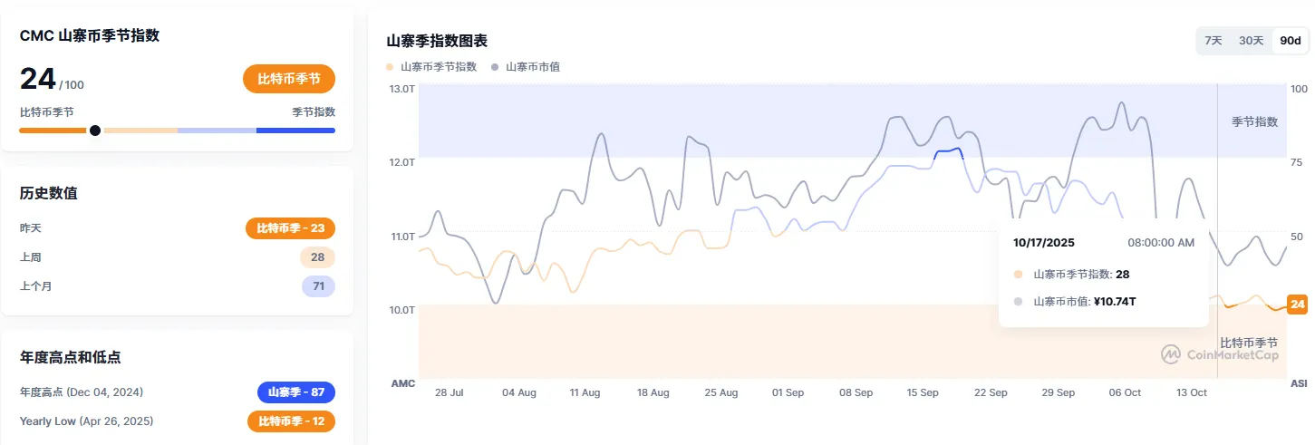 山寨指数:周五报 26,维持低位震荡,主流山寨跑输 BTC,流动性波动率极低;