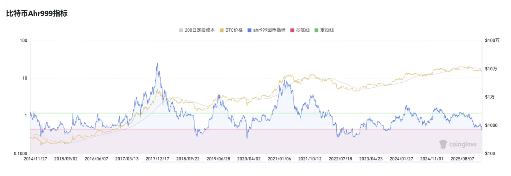 ahr999 指标多年前由微博用户 ahr999 发明,用于评估 BTC 短期回报与价格偏差。该指标计算公式为(当前价格 / 200 日定投成本)×(当前价格 / 指数增长估值),其中指数增长估值基于历史价格和区块高度的拟合曲线,代表长期「公允价值」。历史经验显示:ahr999 < 0.45 为低价买入区;0.45-1.2 适合定投;>1.2 为高价区。