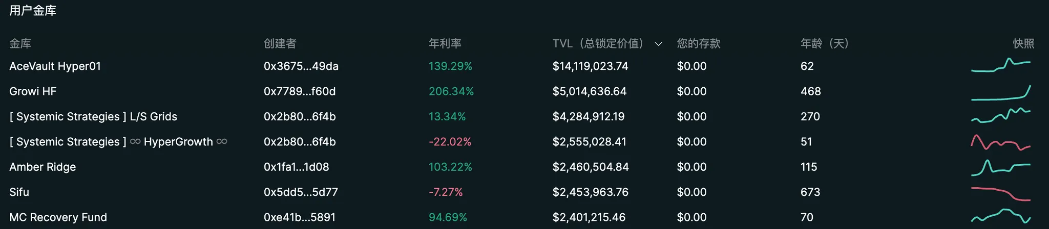 为进行客观、多维度的比较,我们挑选了 Hyperliquid 上管理规模与业绩表现均位居前列的五个代表性金库,它们分别是:AceVault、Growi HF、Systemic Strategies、Amber Ridge 以及 MC Recovery Fund。
