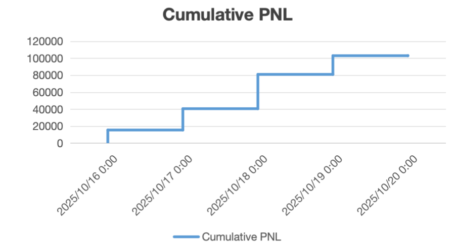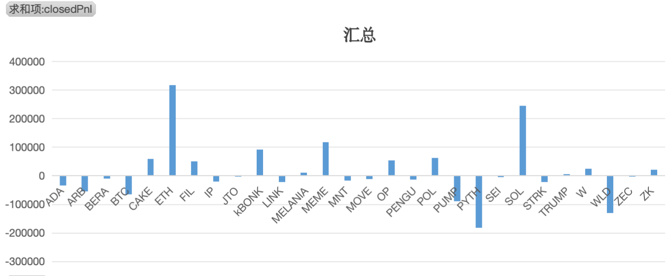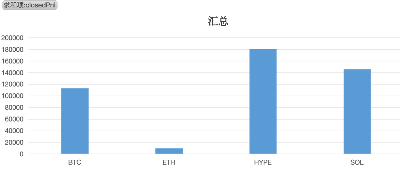 - 币种盈亏: 所有交易的四个币种均实现盈利。其中 $HYPE 的多头头寸贡献了最大的单币盈利(+$180,000),是策略的核心利润来源之一。