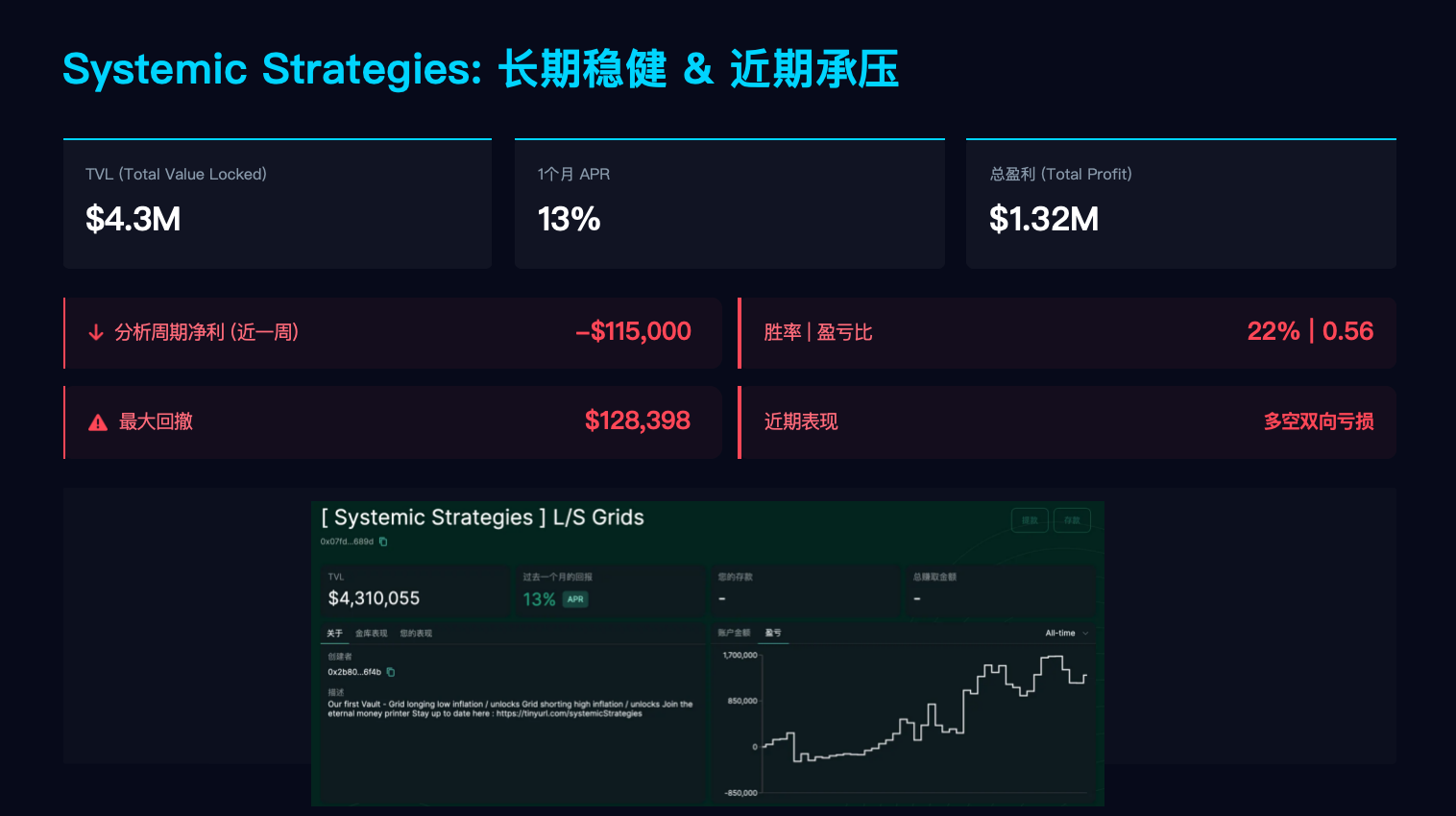 然而,其近一个月的年化回报率 (APR) 仅为 13%,这一数据暗示该策略近期的盈利能力已显著放缓。