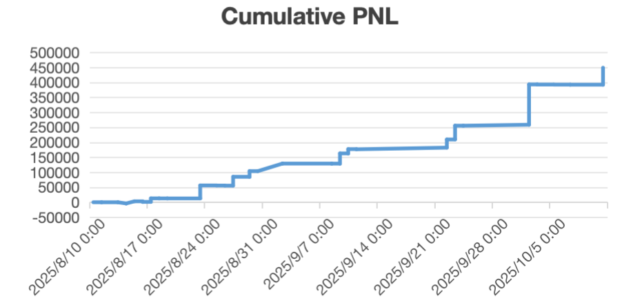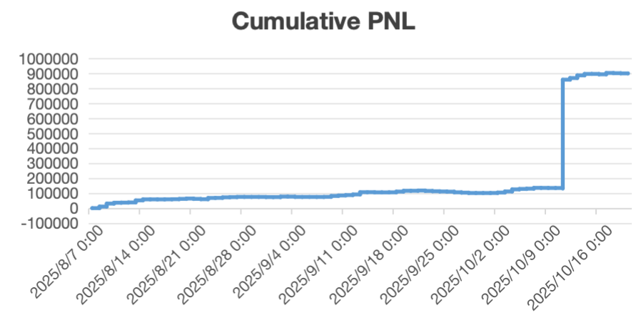 - 方向性盈亏: 策略的绝大部分利润来源于多头头寸(累计盈利 +$886,000),而唯一的空头敞口($LTC)也贡献了少量盈利(+$23,554)。