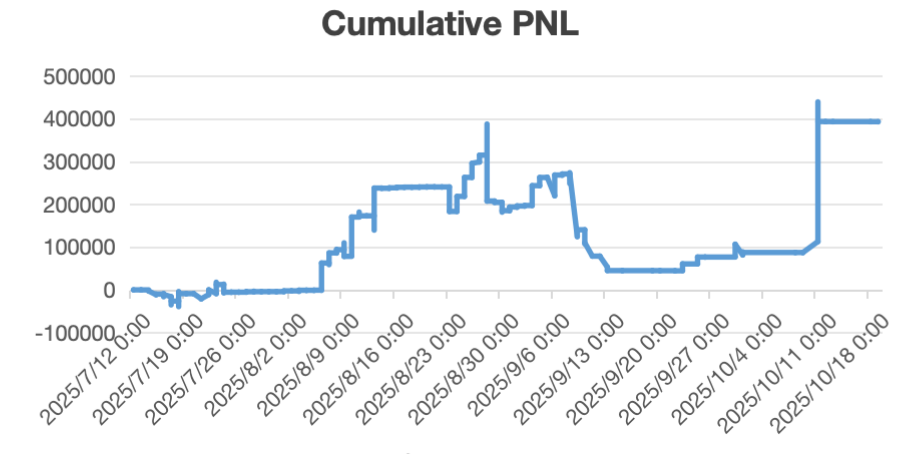 方向性盈亏: 策略的全部净利润来源于其多头头寸。数据显示,多单累计盈利 $500,000,而空单累计亏损 $110,000。这一数据清晰地表明,在分析的市场周期内,做多主流币的收益远超做空山寨币的亏损。
