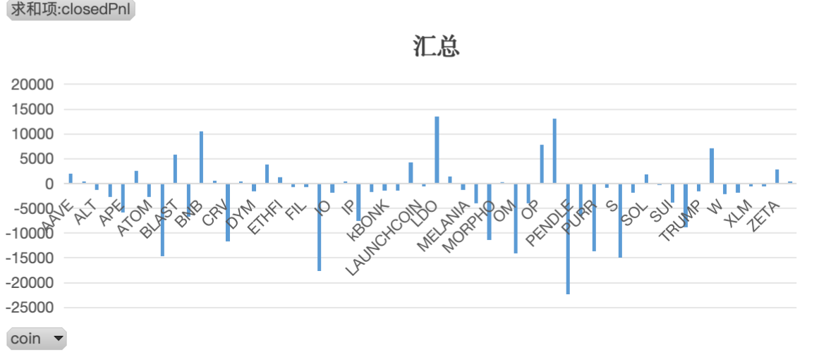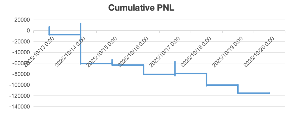 - 币种归因: 在交易的 56 个币种中,大部分录得亏损。最大的单币种亏损来源于 $PENDLE 的多头头寸(-$22,000),而最大的单币种盈利来自 $LDO 的多头头寸(+$13,000),但个别盈利的规模远不足以抵消广泛的亏损面。