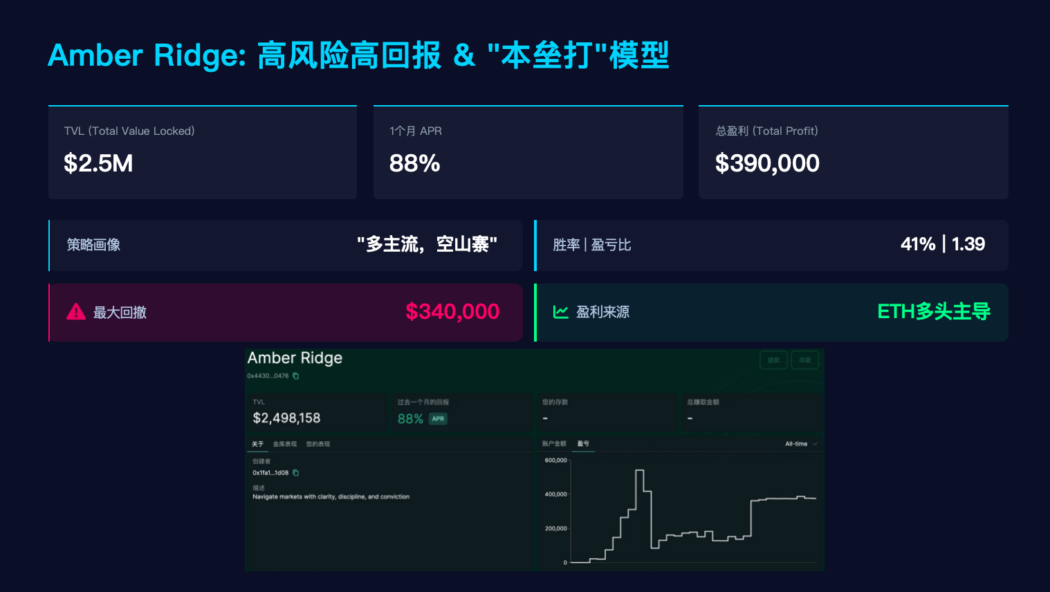 Amber Ridge 是 Hyperliquid 生态中一个策略画像极为清晰、风格鲜明的策略金库。截至 2025 年 10 月 20 日,其总锁仓价值为 250 万美元。该金库自 2025 年 7 月启动运营至今,已累计实现 39 万美元的盈利,其近一个月的年化回报率达到 88%,显示出显著的盈利潜力。