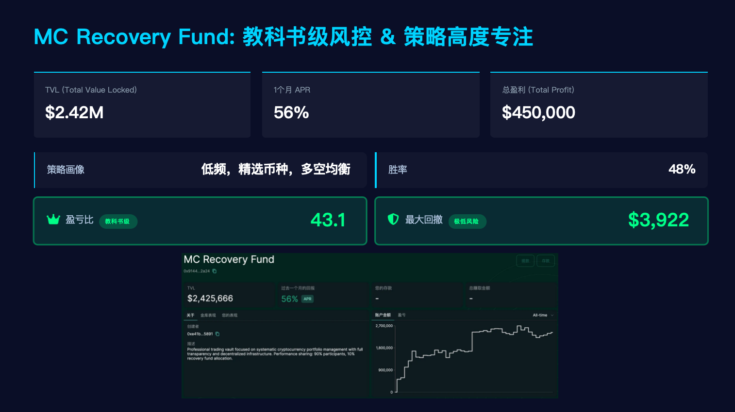 MC Recovery Fund 是 Hyperliquid 生态中一个策略高度专注的策略金库。截至 2025 年 10 月 20 日,其总锁仓价值为 242 万美元。该金库自 2025 年 8 月启动运营以来,已累计实现 45 万美元的盈利,其近一个月的年化回报率为 56%,显示出稳健的回报能力。