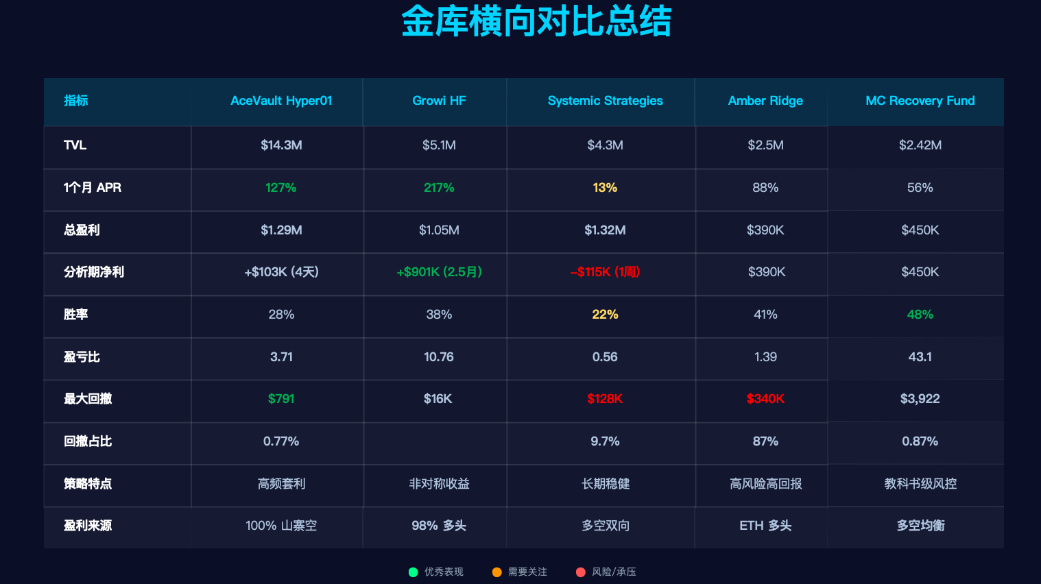 通过对 Hyperliquid 五大顶级金库(AceVault, Growi HF, Systemic Strategies, Amber Ridge, MC Recovery Fund)的深度量化分析,我们得以穿透高额 APR 和总盈利的表象,洞察其策略的核心——并非所有的高收益都“生而平等”。