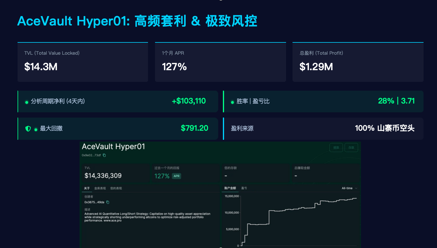 AceVault Hyper01 不仅是 Hyperliquid 生态中管理资产规模 (TVL) 最大的策略金库之一,其业绩表现同样引人注目。截至 2025 年 10 月 20 日,该金库的 TVL 已高达 1433 万美元。自 2025 年 8 月运营至今,该策略已累计实现 129 万美元的盈利,其近一个月的年化回报率 (APR) 高达 127%,显示出强大的、可持续的 alpha 生成能力。