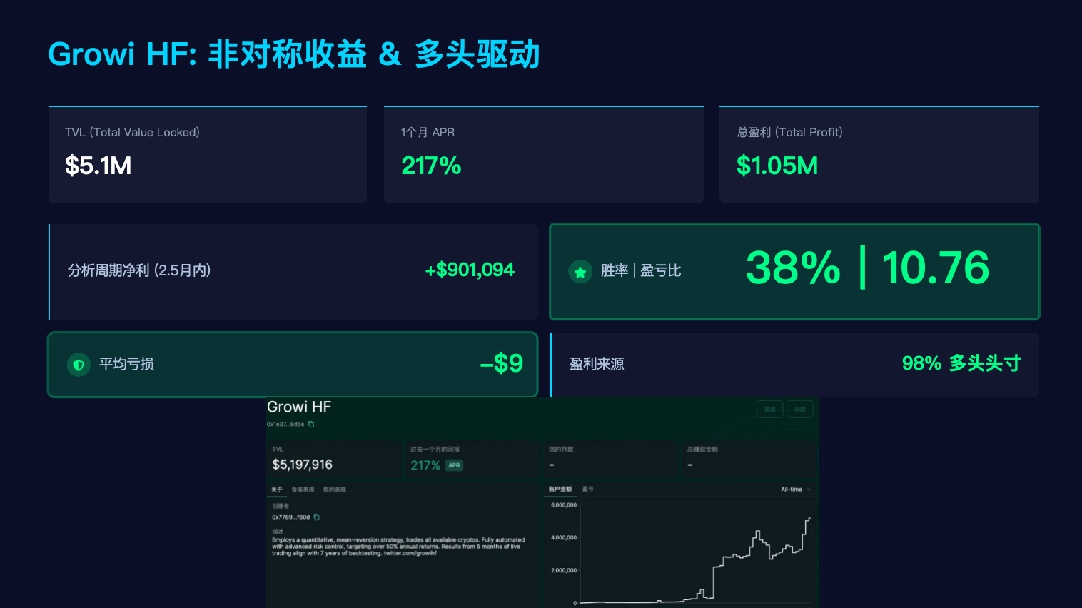 策略画像:极致非对称的“多头猎手” 与 AceVault 相似,Growi HF 的盈利模型同样建立在非对称的收益结构之上,但其表现形式更为极致。38% 的胜率与高达 10.76 的盈亏因子,揭示了其策略的核心:通过少数(但盈利极高)的交易,来完全覆盖多数(但亏损极微)的交易。